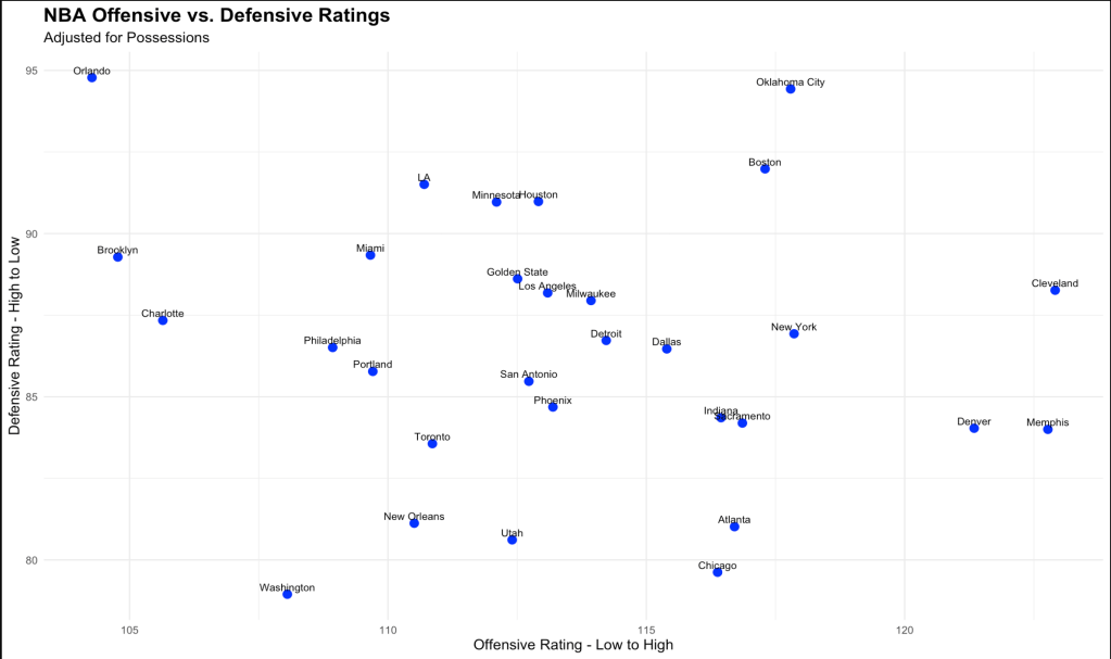 To represent this, we show a dot plot chart that represents the defensive and offensive rating of each team on an X and Y axis. The higher you are on the graph, the better defensively you are, and the farther right you are on the graph, the better you are on offense.
