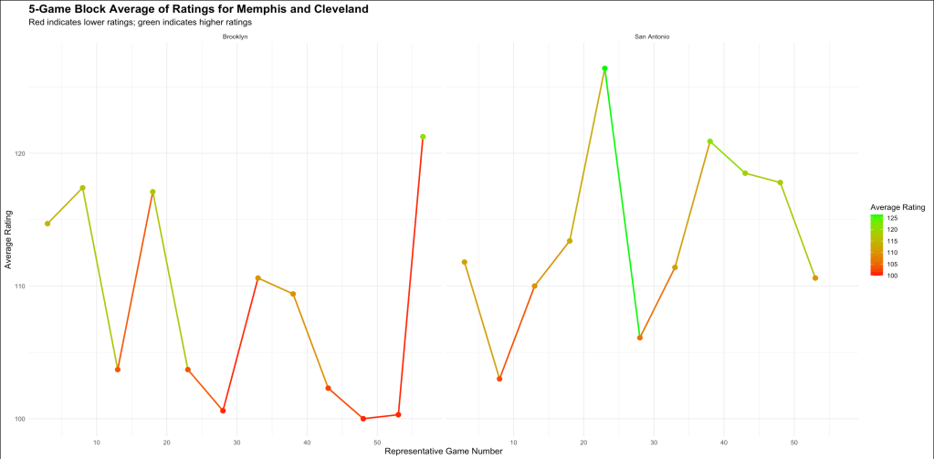 On the flip side, Brooklyn and San Antonio have been all over the place, with big peaks followed by sudden drops. This tells us that while having talent is important, being able to perform consistently game after game is what really separates the good teams from the struggling ones as we get closer to the playoffs.
